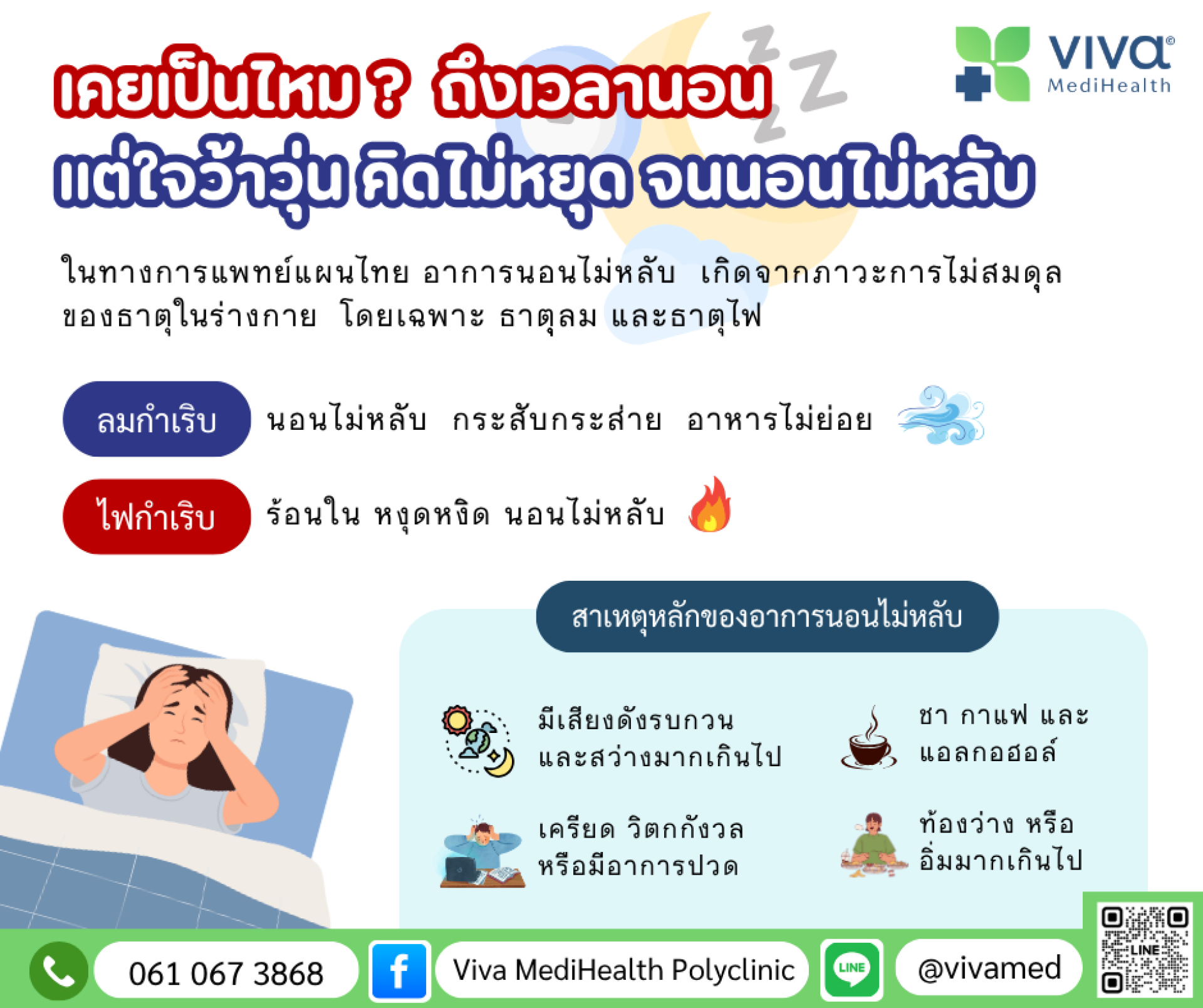 สาเหตุ: ไฟในร่างกายกำเริบ ทำให้ร่างกายร้อนและจิตใจไม่สงบ