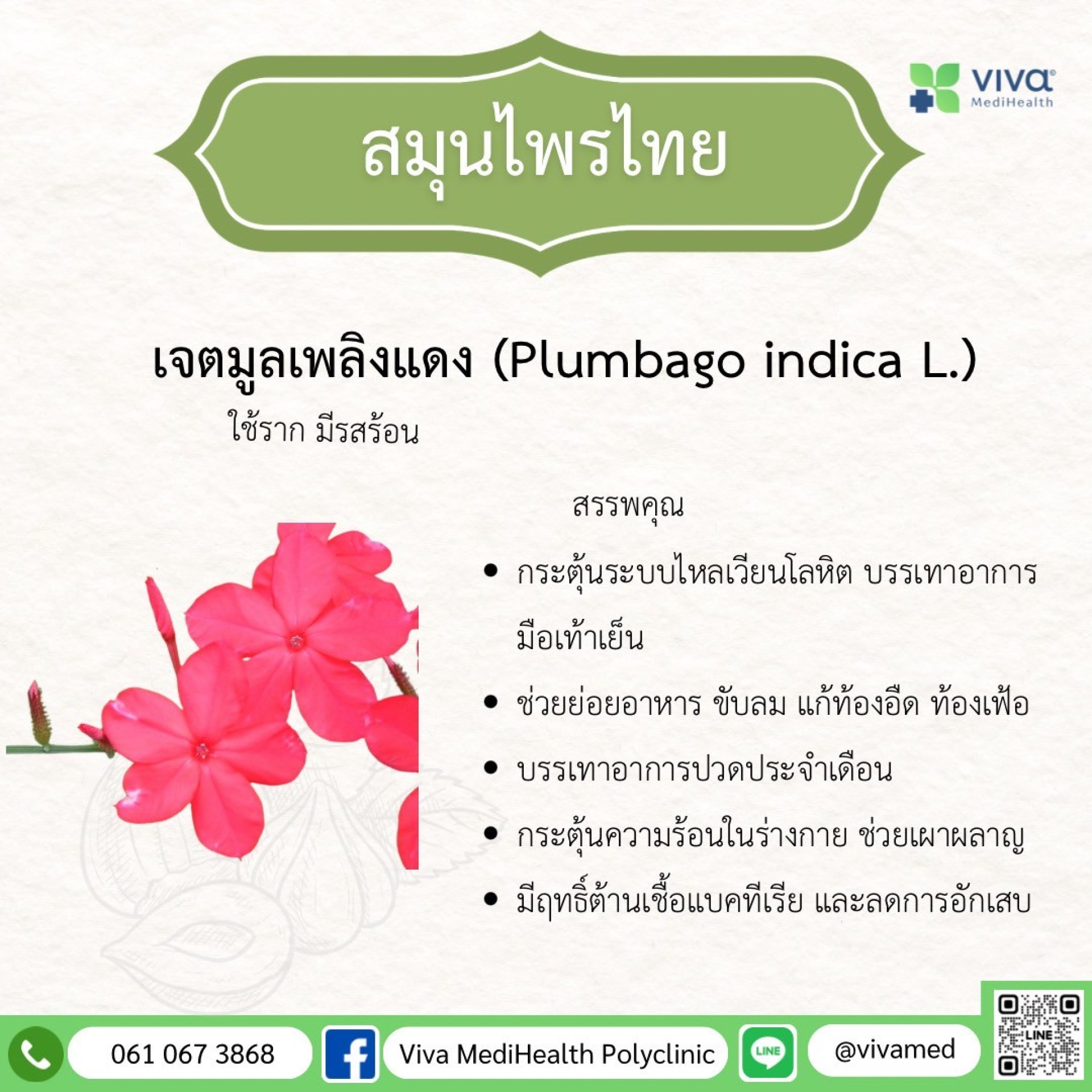 In Thai traditional medicine, Red Plumbago is used to enhance the fire element in the body, supporting both the digestive and circulatory systems. It is especially beneficial for individuals with cold body types or a lack of internal warmth.